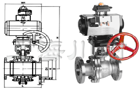 Q641Y帶(dài)手動氣動硬密封(fēng)球閥(fá)廣泛應用(yòng)於化工、石油(yóu)、製藥、輕工等行業的自動控製。采用V型通道(dào)球體結構與電子式電(diàn)動執行器配套(tào)可實(shí)現流量的調節。手輪機構底麵和閥(fá)門連(lián)接,支架麵與氣缸連接,閥軸與蝸輪內孔配合穿過,閥軸端四方與氣缸方孔(kǒng)配合。氣動時(shí),氣(qì)缸帶動閥軸、蝸輪(lún)同轉。手動時,蝸杆與蝸輪齒合,帶動閥軸轉(zhuǎn)動(dòng),氣缸活塞隨時。